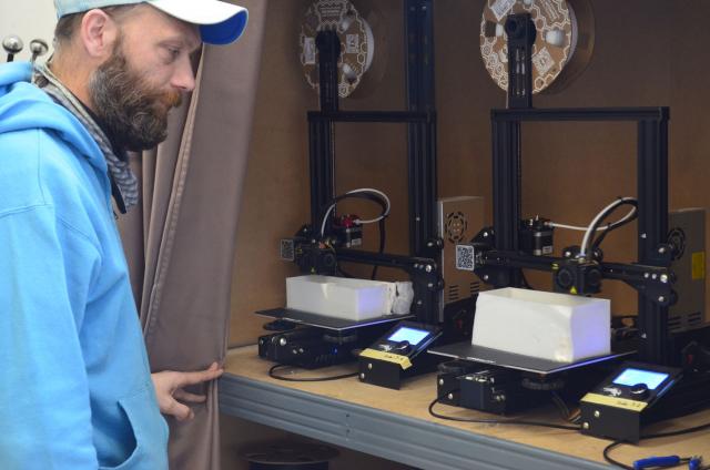 Il nous a ouvert les portes de son atelier. Sur la table : des blocs translucides, de la colle et en bruit de fond, les imprimantes 3D qui s'activent. Il semble jouer avec un puzzle géant, à assembler.