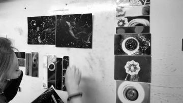 Après cette phase théorique, place à un atelier se développant à partir d’expérimentations au laboratoire photo noir et blanc réduisant la représentation photographique à une empreinte lumineuse sur un support argentique sensible.