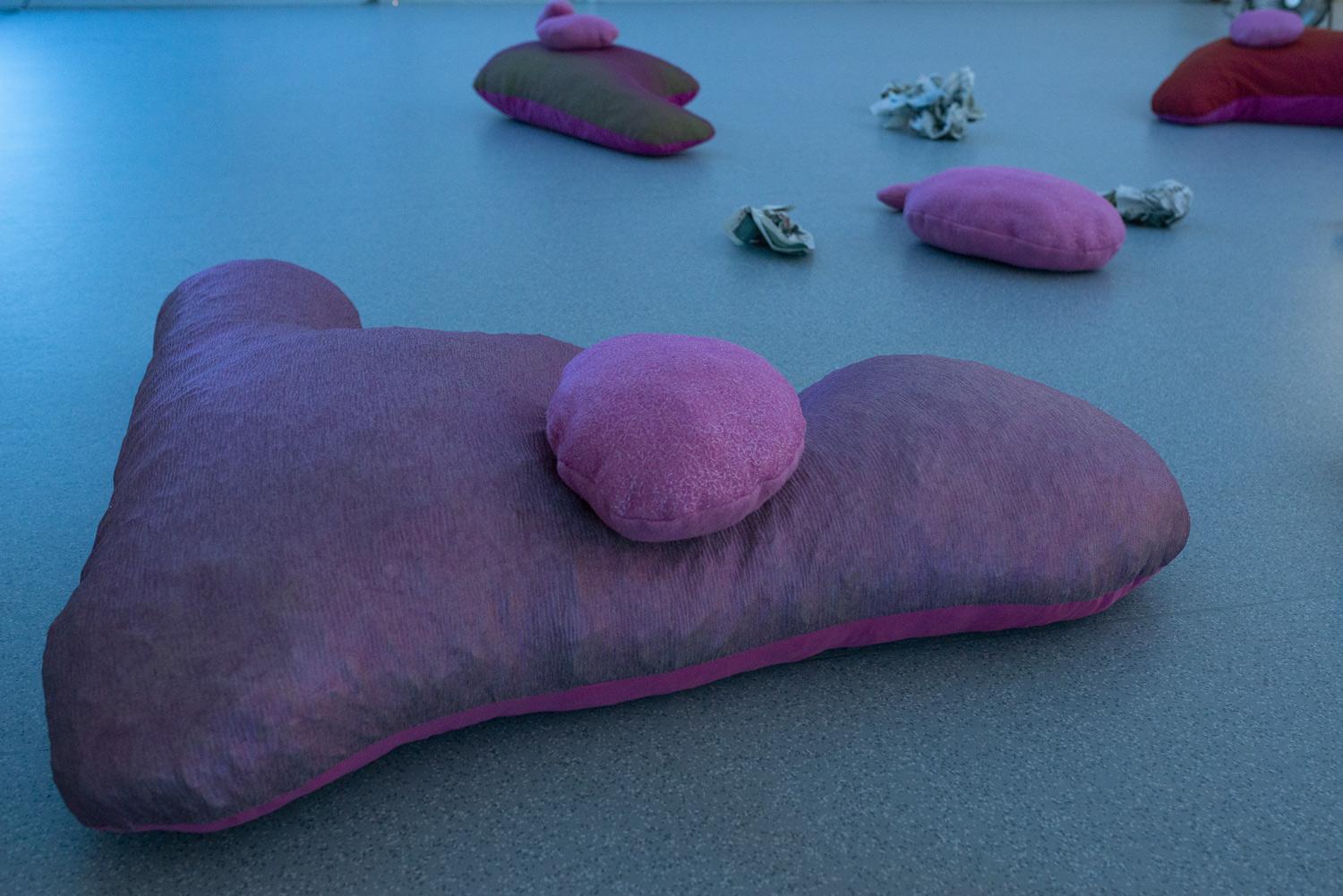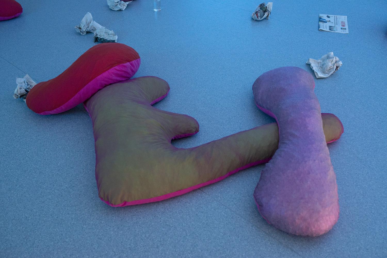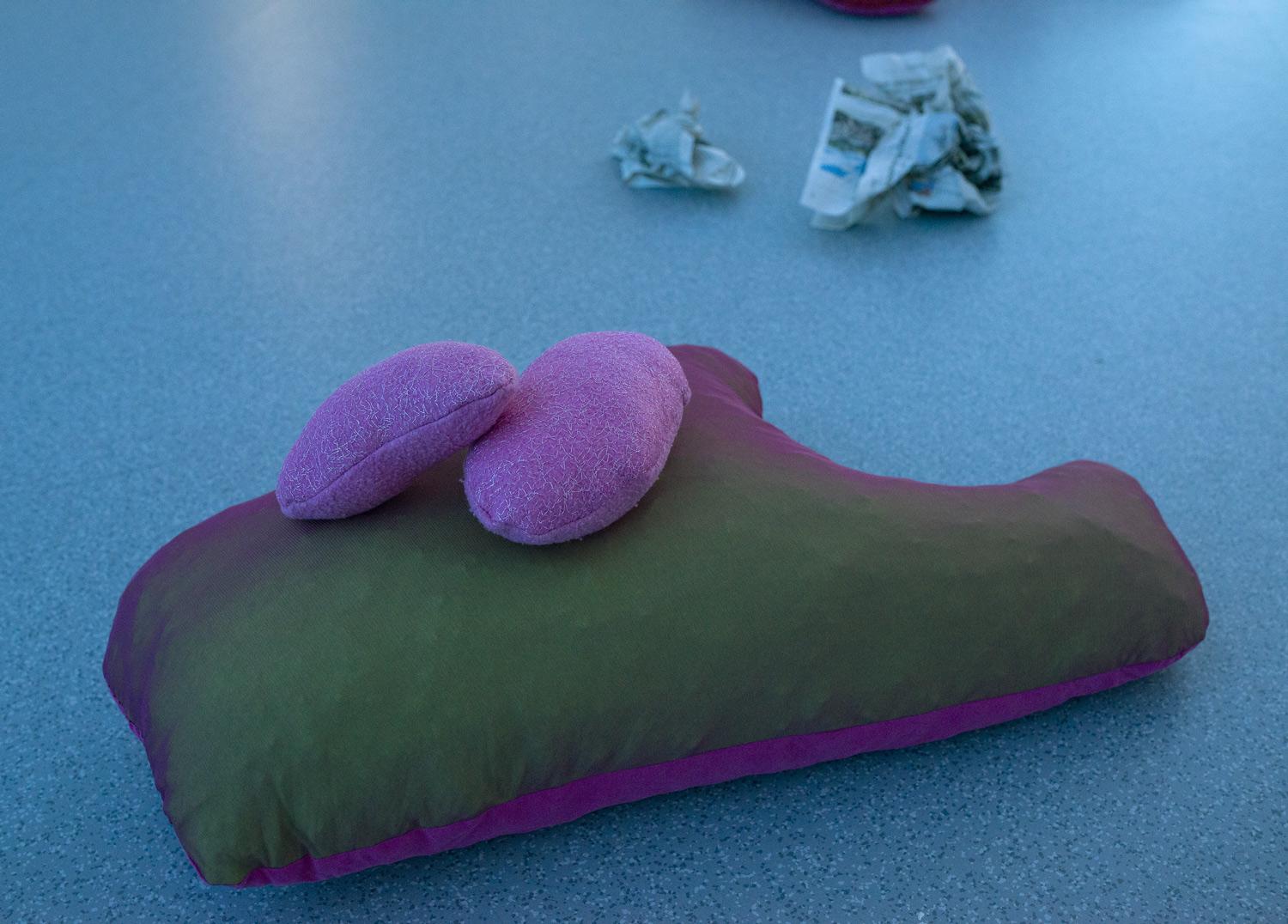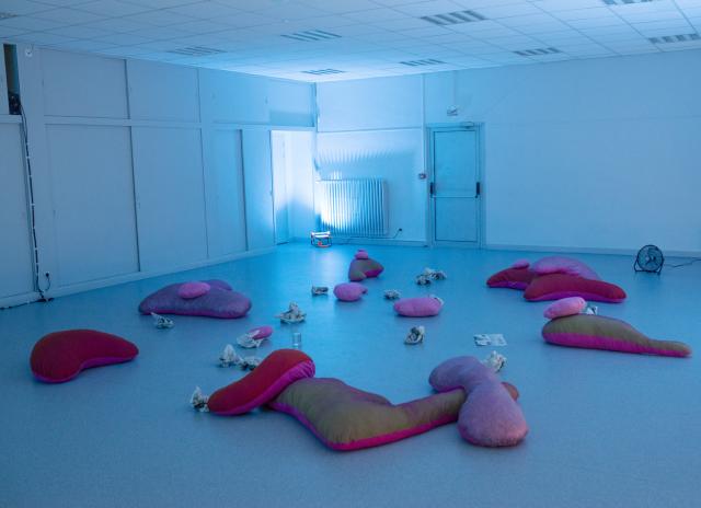 Dans la continuité de son mémoire intitulé Gut Feelings, Amandine Lesca explore les gestes de lenteur, de transformation et de relation à la digestion — réelles ou symboliques — comme autant de façons d’habiter le monde depuis une intimité organique. Son projet de diplôme prend la forme d’une performance immersive et sensorielle, au sein d’un environnement fait de coussins-organes, qui invite à une lente descente dans les replis de l’espace. Dans cette atmosphère, les corps se métamorphosent au contact de présences invisibles aux voix multiples.