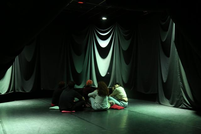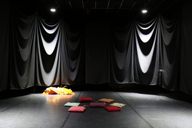 Dans ce cylindre de tissus noirs suspendu, appelant à la danse en cercle, à la paréidolie des cavernes, au sacré des temples, à la magie du théâtre, se joue l’enjeu de la fiction et sa capacité à se réaliser