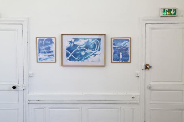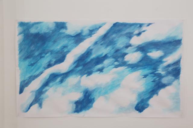 subtilement sa présence. En utilisant des médiums tels que le pastel sec ou l’encre, elle crée des textures qui évoquent le grain des nuages et la transparence de l’altitude.