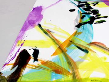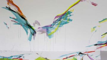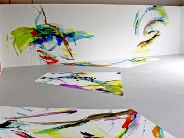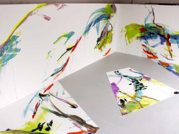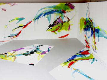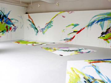 Par une pratique performative de la peinture, je m'intéresse aux interactions entre le geste et l'espace pictural, à la relation kinesthésique et calligraphique des mouvements du corps dans l'espace architectural. Imprégnée de la calligraphie, l'action painting ou encore de l'abstraction gestuelle, j'utilise des gestes spontanés et intuitifs pour créer une narration picturale dans laquelle personnages, paysages et compositions sont libres d'émerger. Ce processus consiste à regarder les traces gestuelles de peinture et effacer les traces qui ne sont pas nécessaires dans la composition, ne garder seulement ce que je considère comme essentiel.