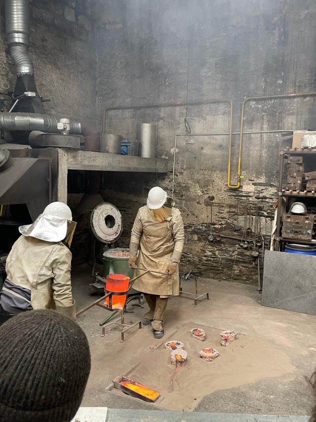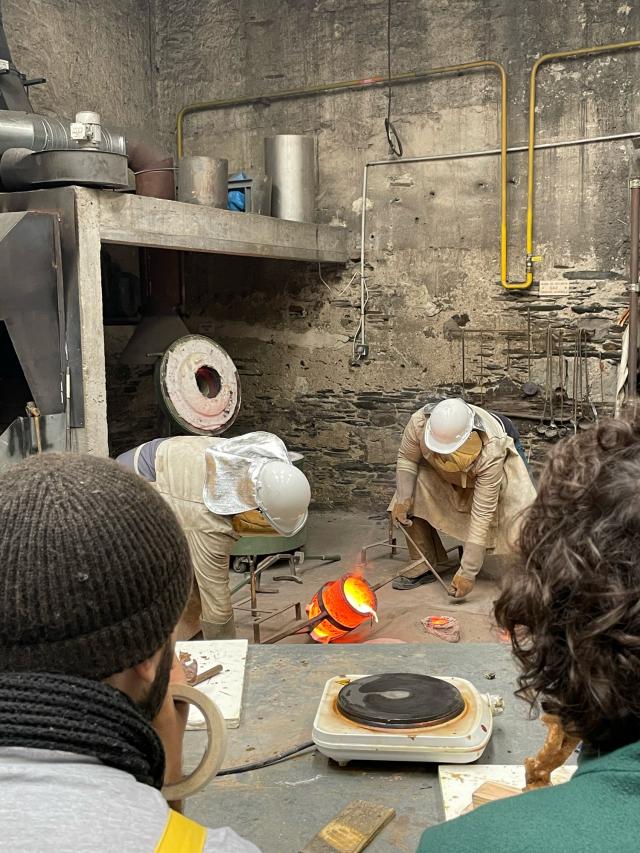 La fonderie est accessible à tout·es les élèves dès la deuxième année. Le travail s’effectue en petit groupe, dix élèves maximum et permet les coulées en aluminium ou en bronze. Les matrices sont généralement réalisées par les élèves en terre, en cire, etc. L’atelier permet une coulée par semaine.